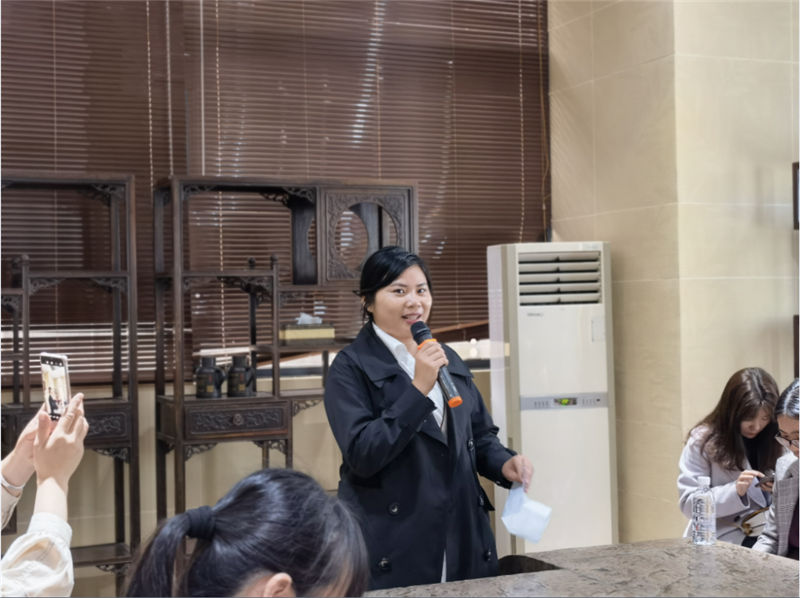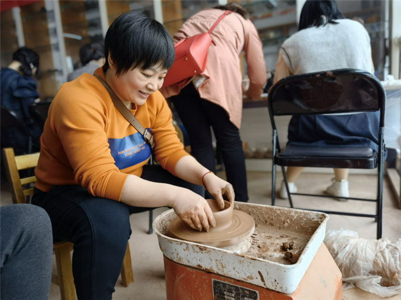 坭興陶文化體驗活動分為文化知識講解和制作體驗兩部分。文化館負責人詳細講解欽州市泥興陶歷史文化、成就,并帶領(lǐng)女職工們參觀陶器燒制現(xiàn)場和泥興陶成品,介紹泥興陶制作過程以及煙塵處理等知識。在陶藝制作體驗環(huán)節(jié),女職工們認真觀摩陶藝老師的操作演示拉胚和雕刻,并有模有樣的制作,雖然制作出來的作品相對粗糙,但大家如獲至寶。