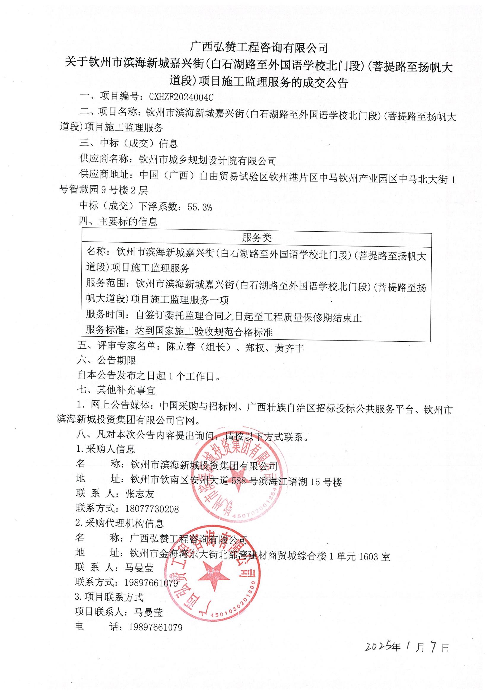 廣西弘贊工程咨詢有限公司關(guān)于欽州市濱海新城嘉興街(白石湖路至外國(guó)語(yǔ)學(xué)校北門(mén)段)(菩提路至揚(yáng)帆大道段)項(xiàng)目施工監(jiān)理服務(wù)的成交公告