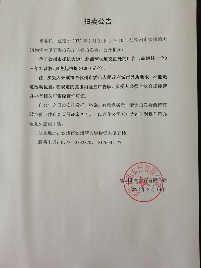 拍賣公告(揚(yáng)帆大道與北部灣大道交匯處廣告經(jīng)營權(quán))