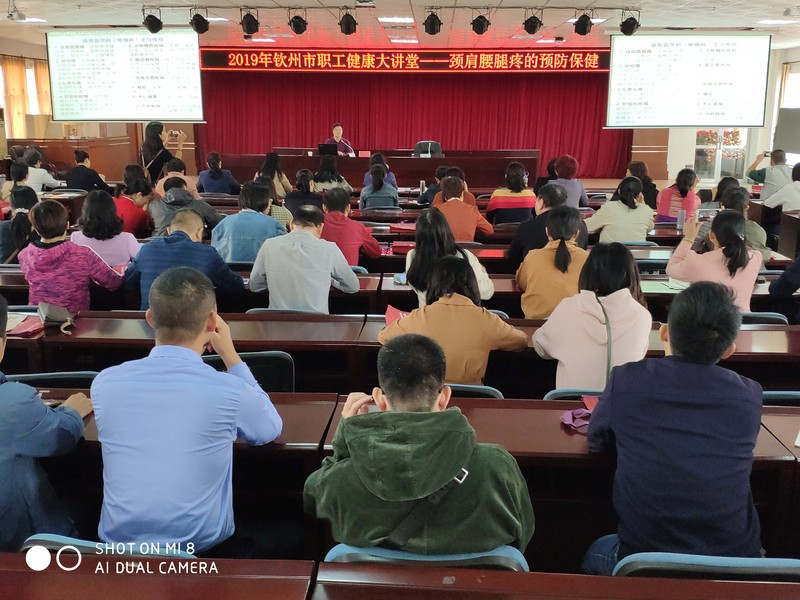 2019年11月14日上午,我集團公司組織職工參加市總工會、市健康教育中心舉辦的“頸肩腰腿疼的預防保健”的職工健康知識公益講座,講座由欽州市中醫(yī)醫(yī)院康復醫(yī)學科主任、醫(yī)學博士、副主任醫(yī)師鐘志年主講。鐘主任通過視頻講解、現(xiàn)場示范,為大家傳授頸肩腰腿疼的預防保健知識,全體參加人員踴躍參與預防保健鍛煉動作的互動。