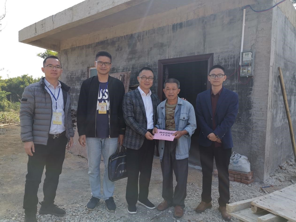 2019年11月14日上午,集團公司董事長趙文博一行在新禾村陳基茂新建的房子前,舉行了一場建房捐資活動,為貧困戶陳基茂送上了1.8萬元的建房資助款,為其新房建設解決燃眉之急,用點滴真情助力脫貧攻堅。新禾村兩委干部、駐村工作組、建房施工隊代表共同見證了建房捐資儀式。