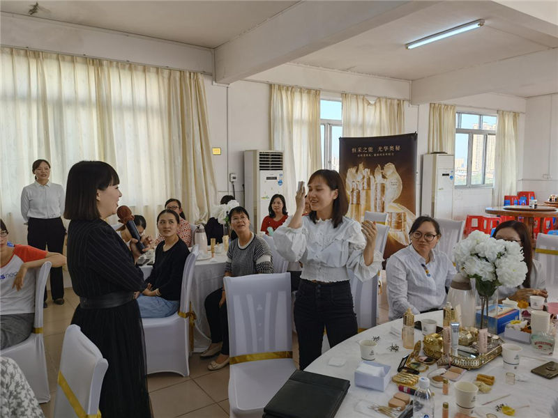 講師從保養(yǎng)護膚到上妝步驟的詳細講解,細心的展示一些日常護膚產(chǎn)品和體驗效果,現(xiàn)場還邀請女員工上臺當模特,一邊化妝一邊講解技巧,讓在場的每位員工零距離感受到了護膚與化妝的魅力。講座還準備了特別小禮品,作為對參加現(xiàn)場競猜環(huán)節(jié)的獎勵,現(xiàn)場抽取了三名幸運兒獲得精美禮品,氣氛異?;钴S。