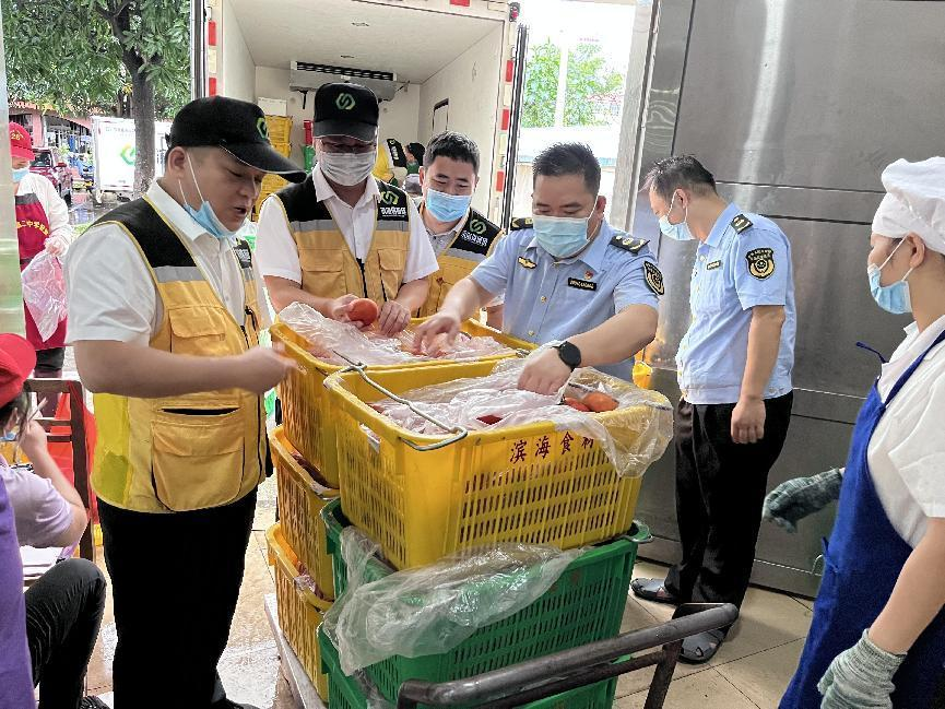 在保供工作進(jìn)行中,濱海供應(yīng)鏈公司始終堅持做到:一、主動接受行業(yè)主管部門的檢查,積極與市直和南北區(qū)市場監(jiān)管部門保持溝通,按要求做好質(zhì)量把控、索證索票、留樣檢測等工作;二、從“食材安全衛(wèi)生、配送安全準(zhǔn)時”為理念,以“五保障”協(xié)議做抓手,工作人員前置農(nóng)產(chǎn)品基地和源頭供應(yīng)商,確保食材質(zhì)量;三、安排食材檢測員貫徹落實索證索票工作,嚴(yán)格開展檢測工作,杜絕三無、有毒有害、過期變質(zhì)等不良品外流,對配送的食材共開展了306批次食材快檢,確保合格率達(dá)到100%;四、以黨建促業(yè)務(wù),充分發(fā)揮黨支部戰(zhàn)斗堡壘作用,以黨員先鋒隊作為主力軍前置各考點,確保食材保質(zhì)保量以及準(zhǔn)時到校,并配合食材檢查和驗收工作;五、充分利用食安平臺明廚亮灶系統(tǒng),有力監(jiān)控跟蹤保障食材安全配送,同時強調(diào)產(chǎn)品溯源,加強校企聯(lián)動,做好應(yīng)急準(zhǔn)備。