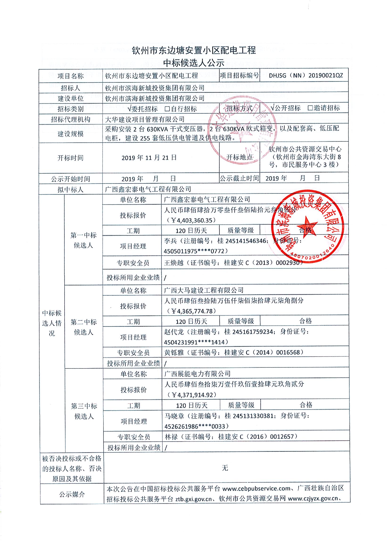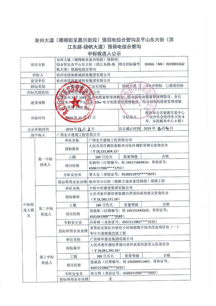 欽州市濱海新城嘉興街(嘉禾街-揚(yáng)帆大道)道路工程及嘉興街(揚(yáng)帆大道-安州大道)地下綜合管廊項(xiàng)目、欽州市公安局沙埠派出所項(xiàng)目、欽州市濱海新城安州大道中段與環(huán)城南路交叉路口工程綜合檢測(cè)中標(biāo)候選人公示 項(xiàng)目名稱 欽州市濱海新城嘉興街(嘉禾街-揚(yáng)帆大道)道路工程及嘉興街(揚(yáng)帆大道-安州大道)地下綜合管廊項(xiàng)目、欽州市公安局沙埠派出所項(xiàng)目、欽州市濱海新...