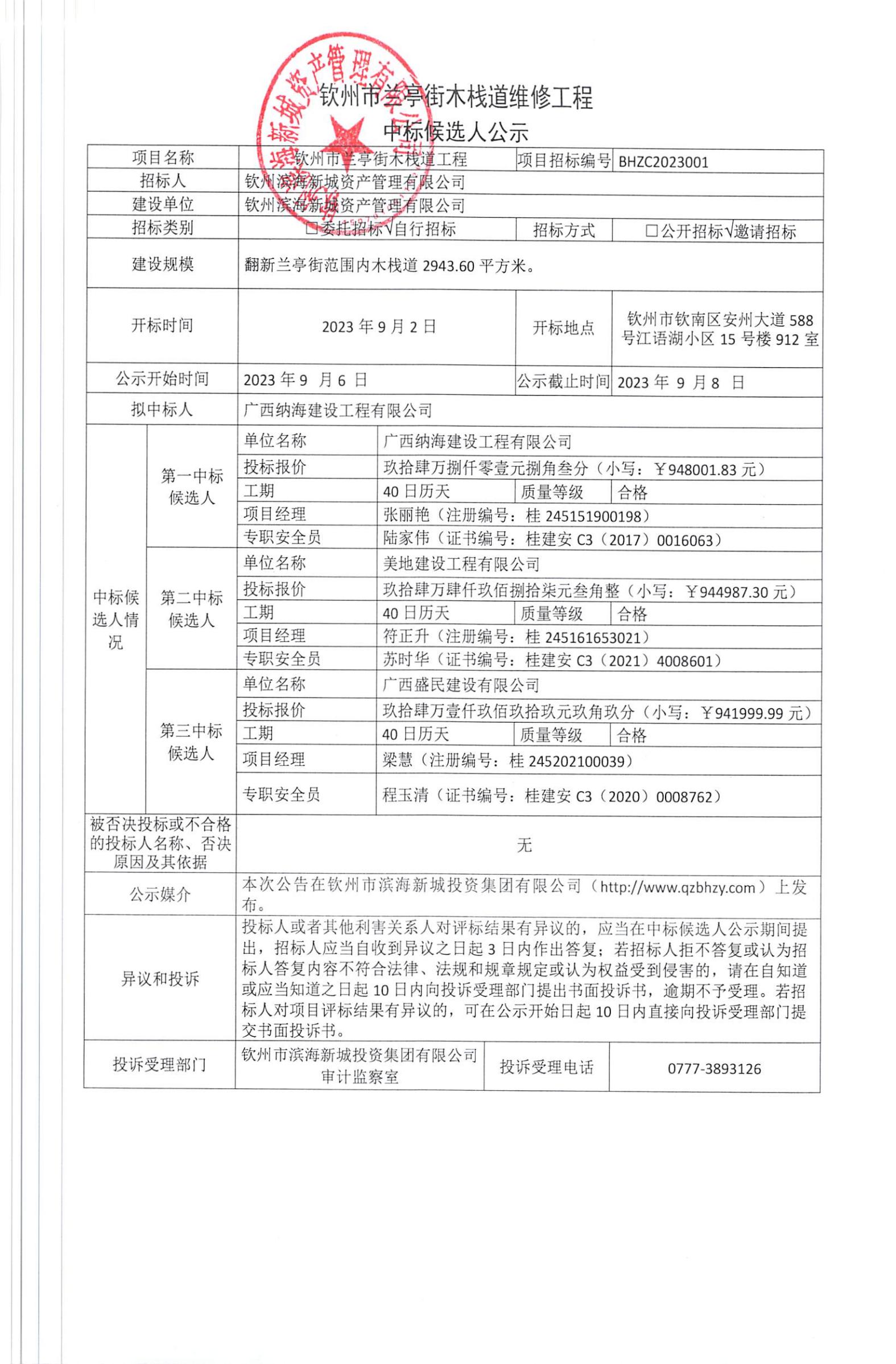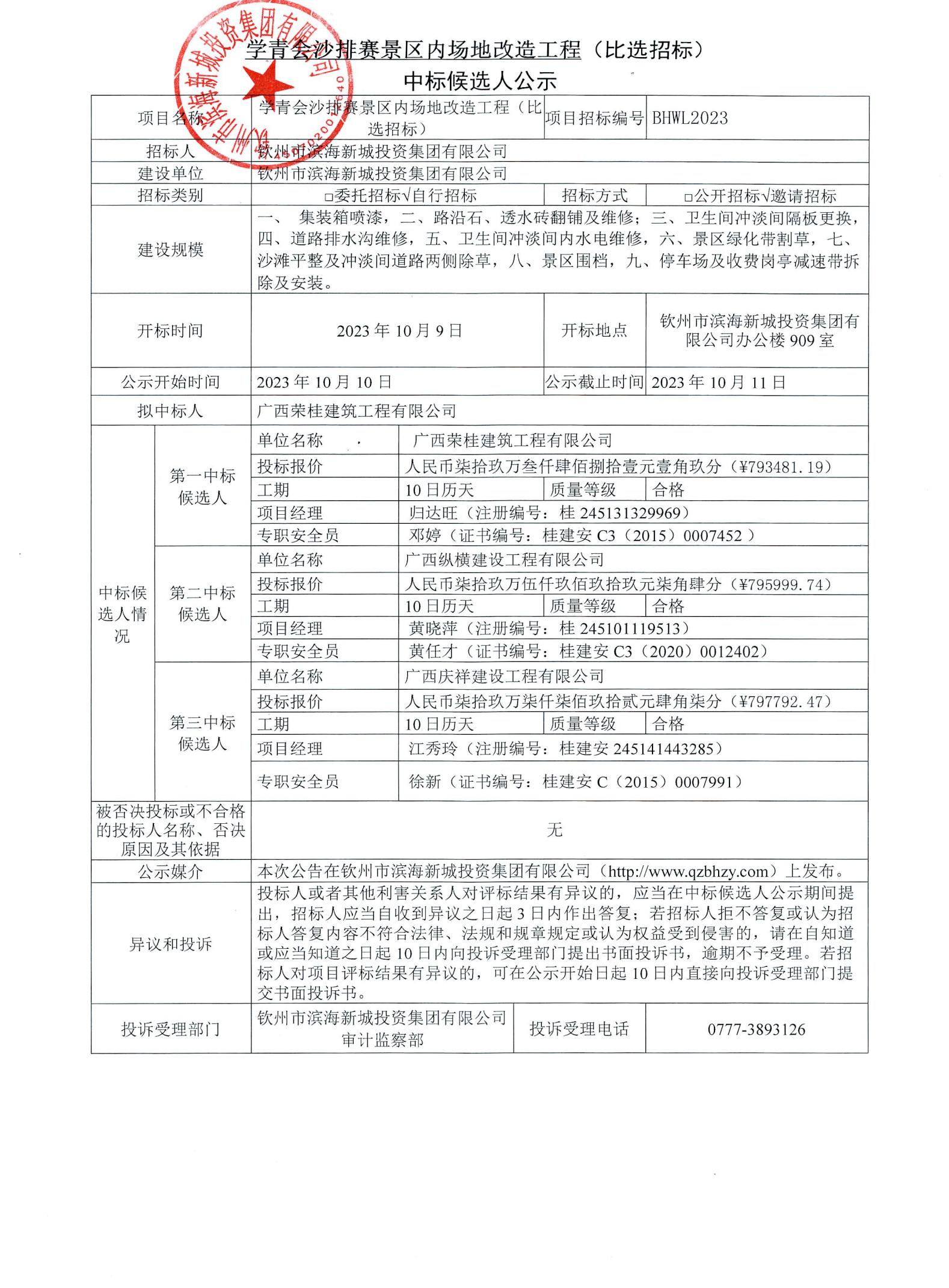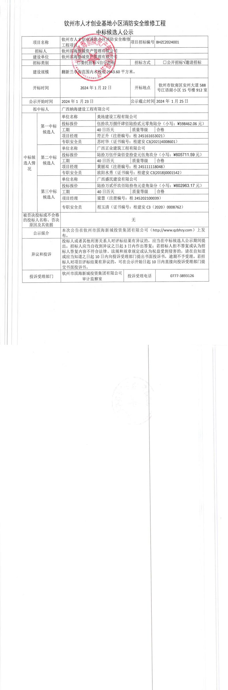 欽州市人才創(chuàng)業(yè)基地小區(qū)消防安全維修工程中標候選人公示