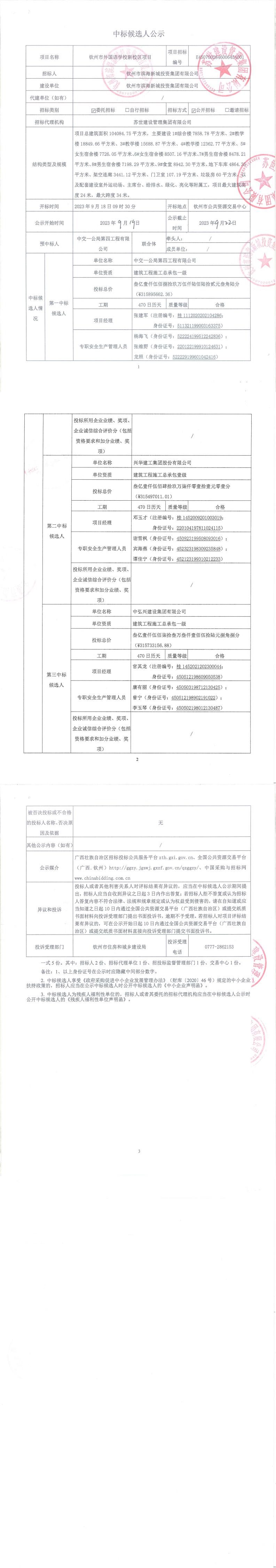 欽州市外國語學校新校區(qū)項目施工中標候選人公示