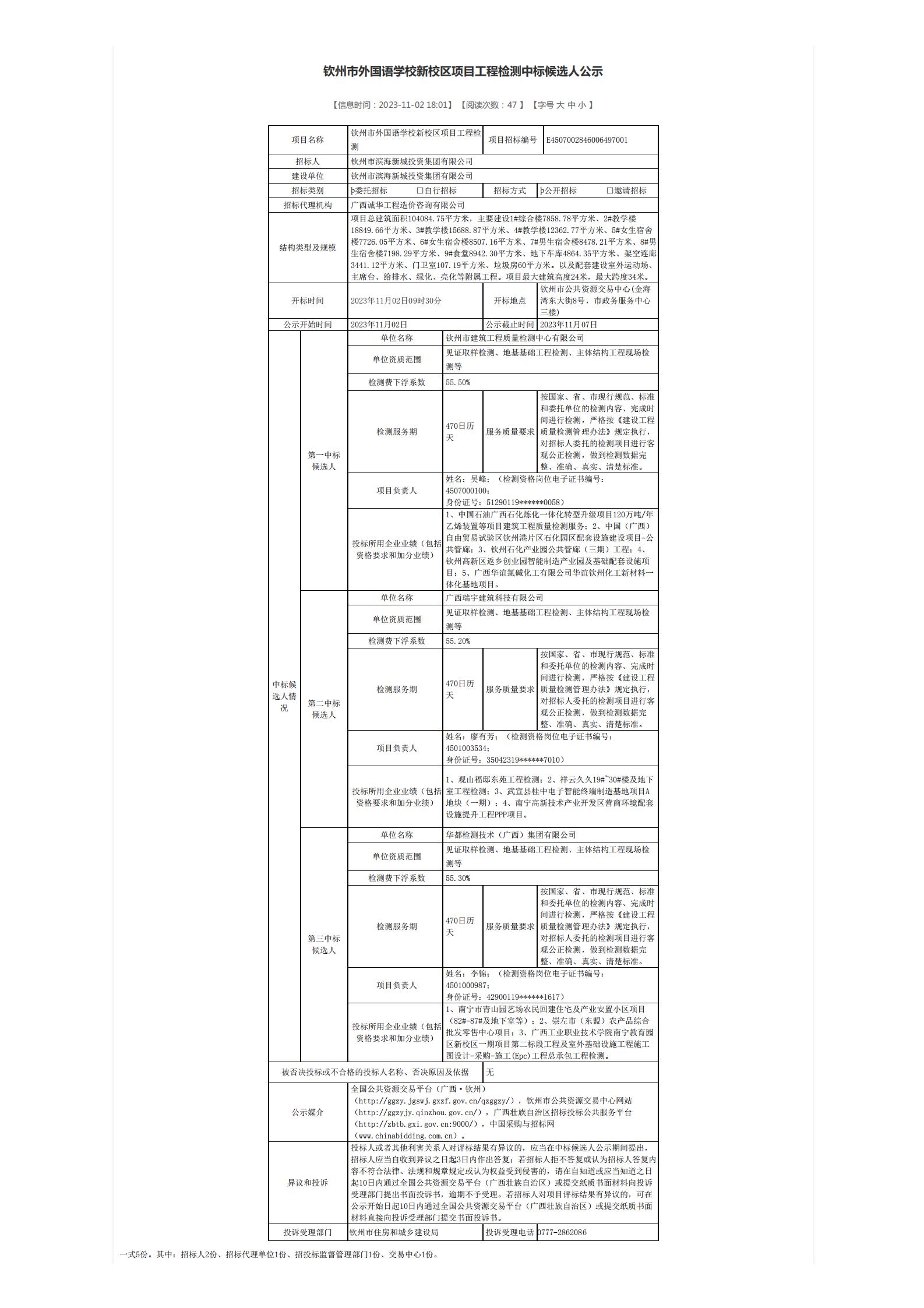 欽州市外國語學校新校區(qū)項目工程檢測中標候選人公示