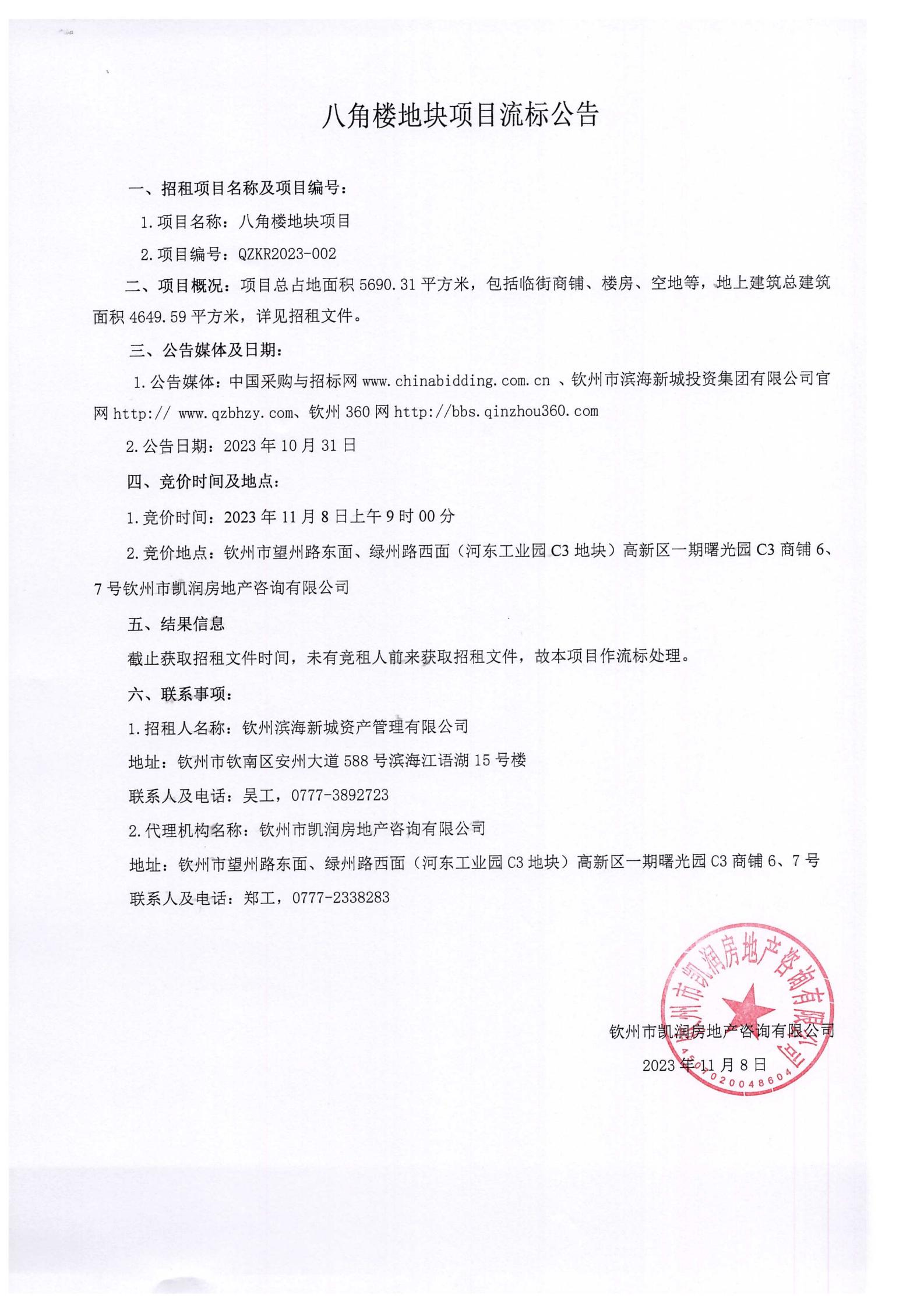 八角樓地塊項目流標公告