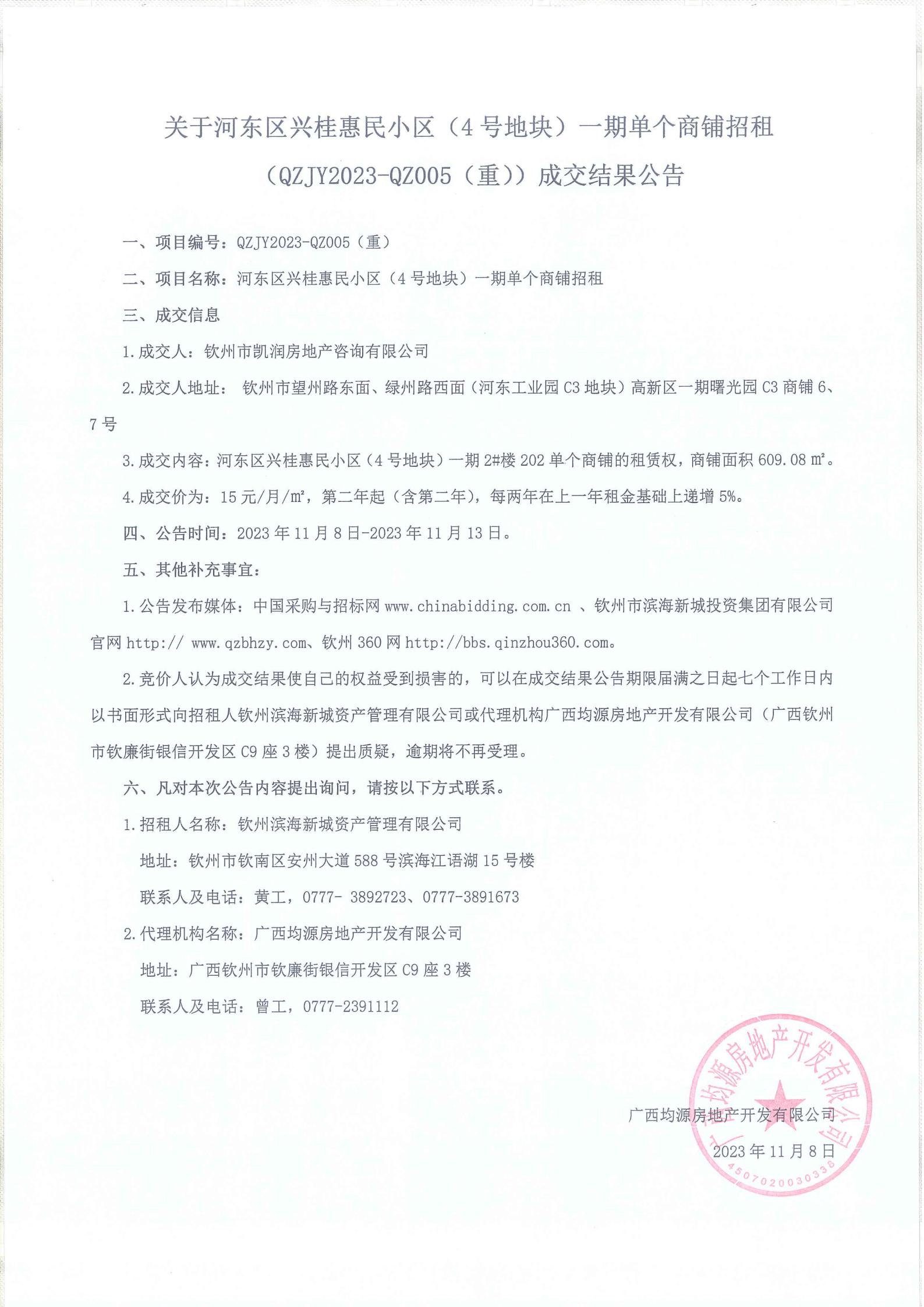 河東區(qū)興桂惠民小區(qū)(4號地塊)一期單個商鋪招租(qzjy2023-qz005(重))成交結(jié)果公告