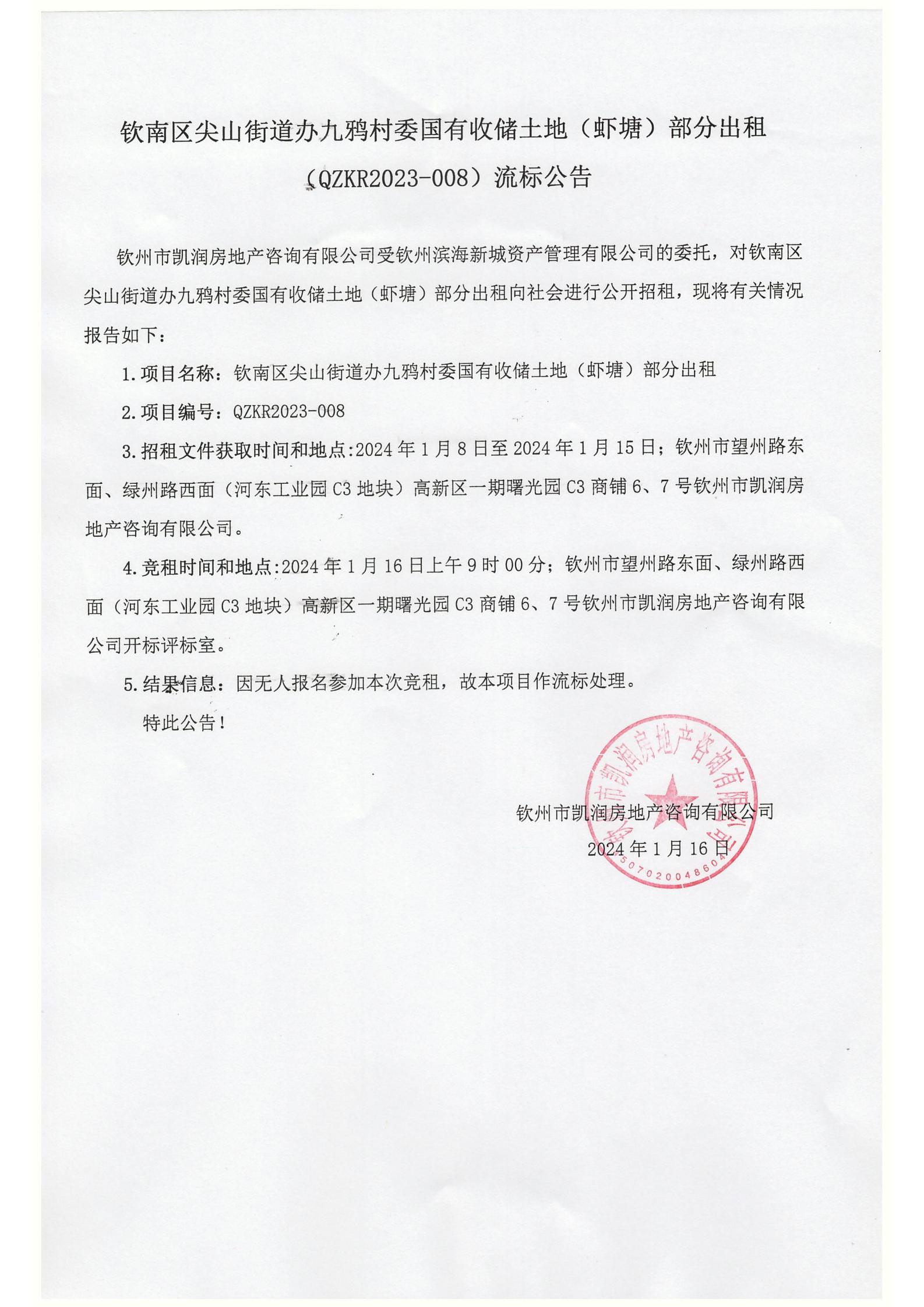 欽南區(qū)尖山街道辦九鴉村委國有收儲土地(蝦塘)部分出租(QZKR2023-008)流標公告