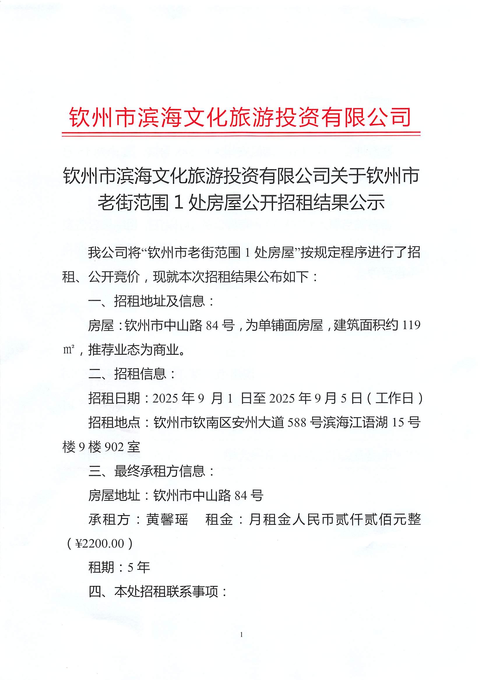 欽州市濱海文化旅游投資有限公司關(guān)于欽州市老街范圍1處房屋公開招租結(jié)果公示