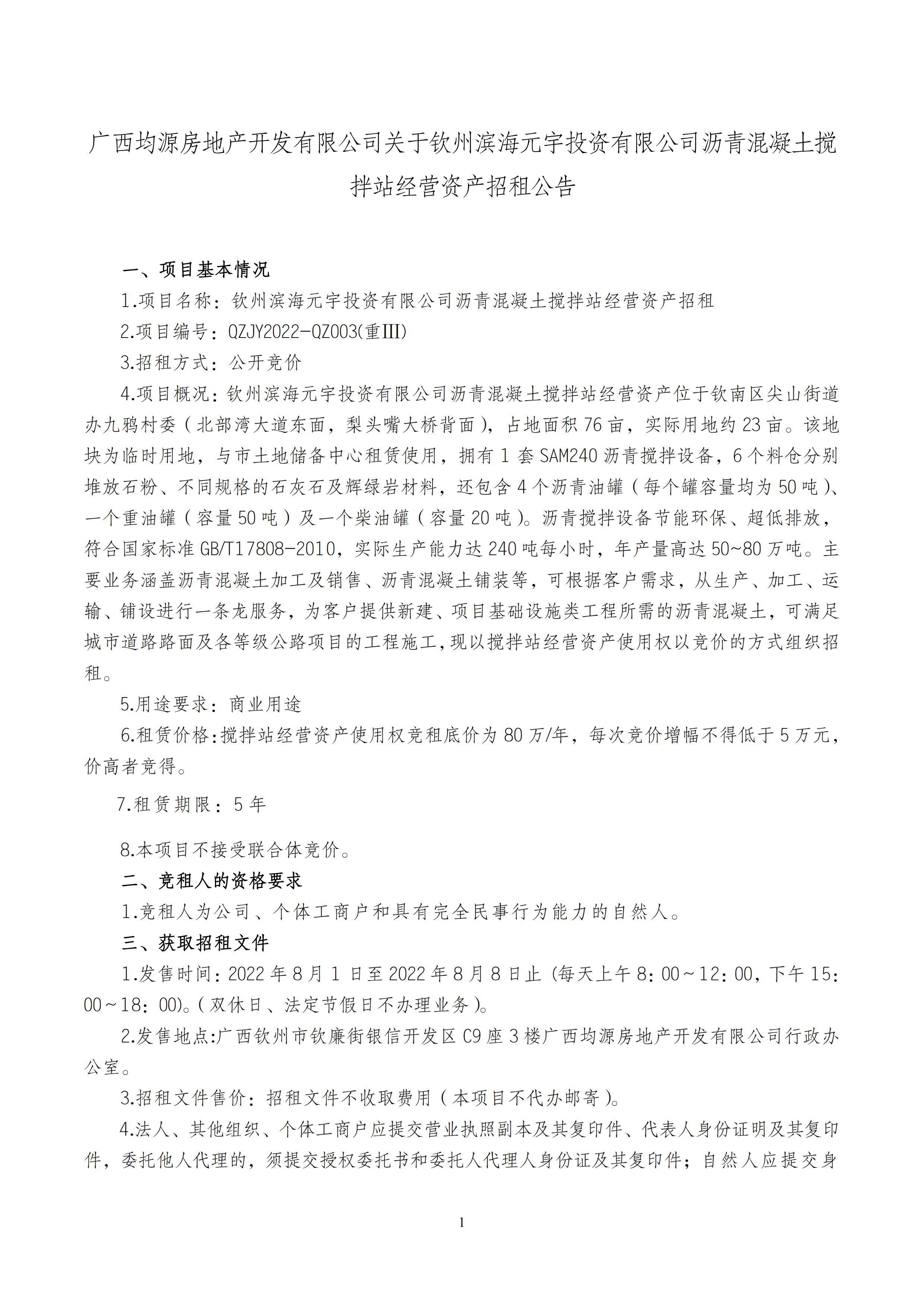 廣西均源房地產(chǎn)開(kāi)發(fā)有限公司關(guān)于欽州濱海元宇投資有限公司瀝青混凝土攪拌站經(jīng)營(yíng)資產(chǎn)招租公告