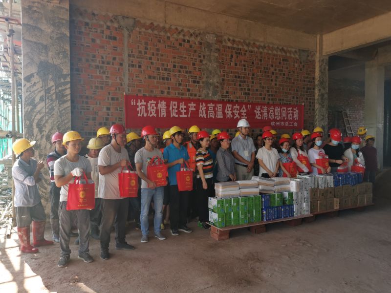 7月13日,欽州市總工會調(diào)研員黃春雯等一行到我集團(tuán)公司負(fù)責(zé)建設(shè)的欽州是茅尾海監(jiān)控監(jiān)測管理基地項目現(xiàn)場,開展“抗疫情 促生產(chǎn) 戰(zhàn)高溫”送清涼慰問活動。在炎炎夏日,為現(xiàn)場辛勤勞作的農(nóng)民工獻(xiàn)上一份清涼。致謝每一位在一線工作的人員,感謝他們?yōu)槲覀兂鞘邪l(fā)展貢獻(xiàn)一份力量。