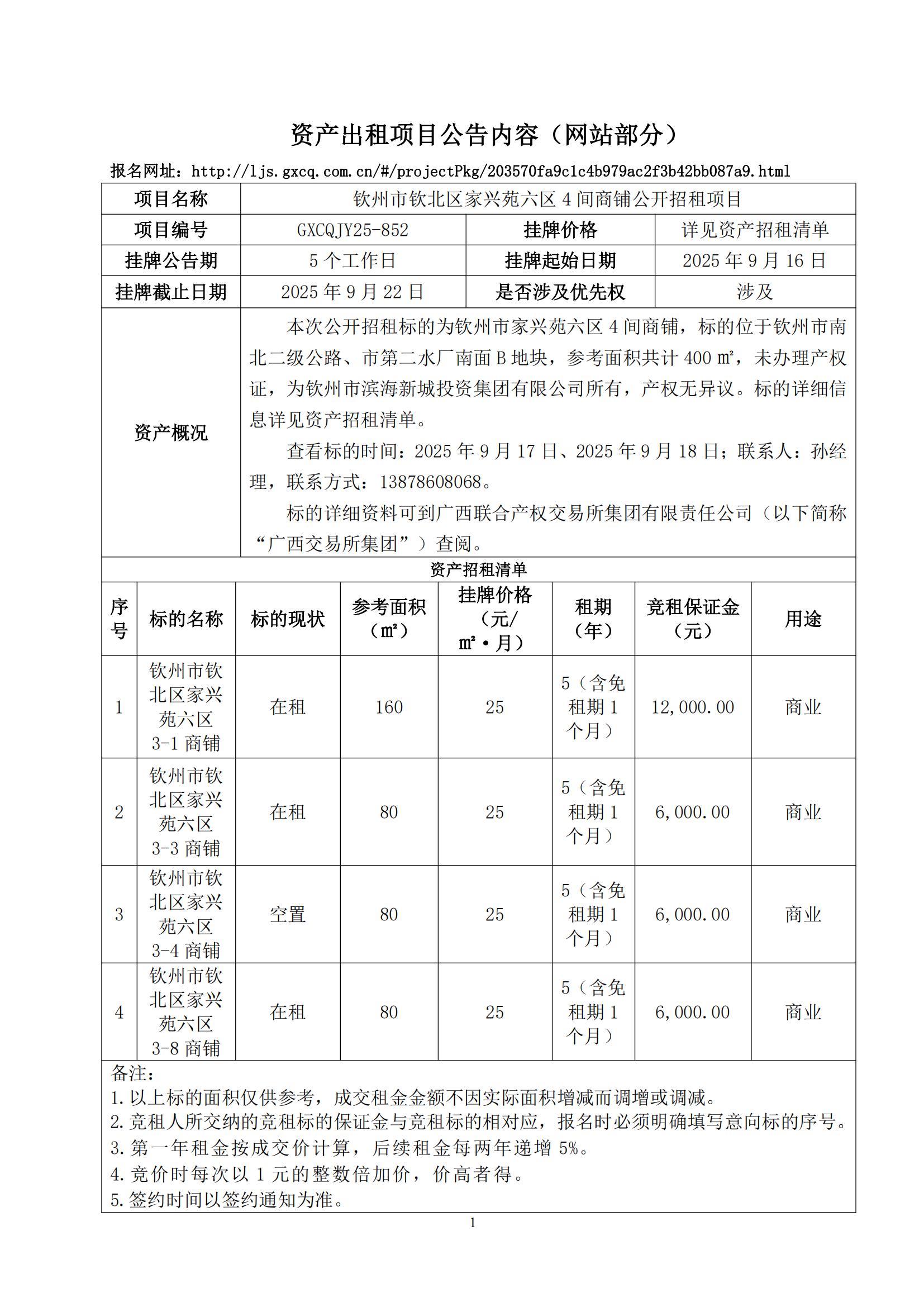 欽州市欽北區(qū)家興苑六區(qū)4間商鋪公開招租公告